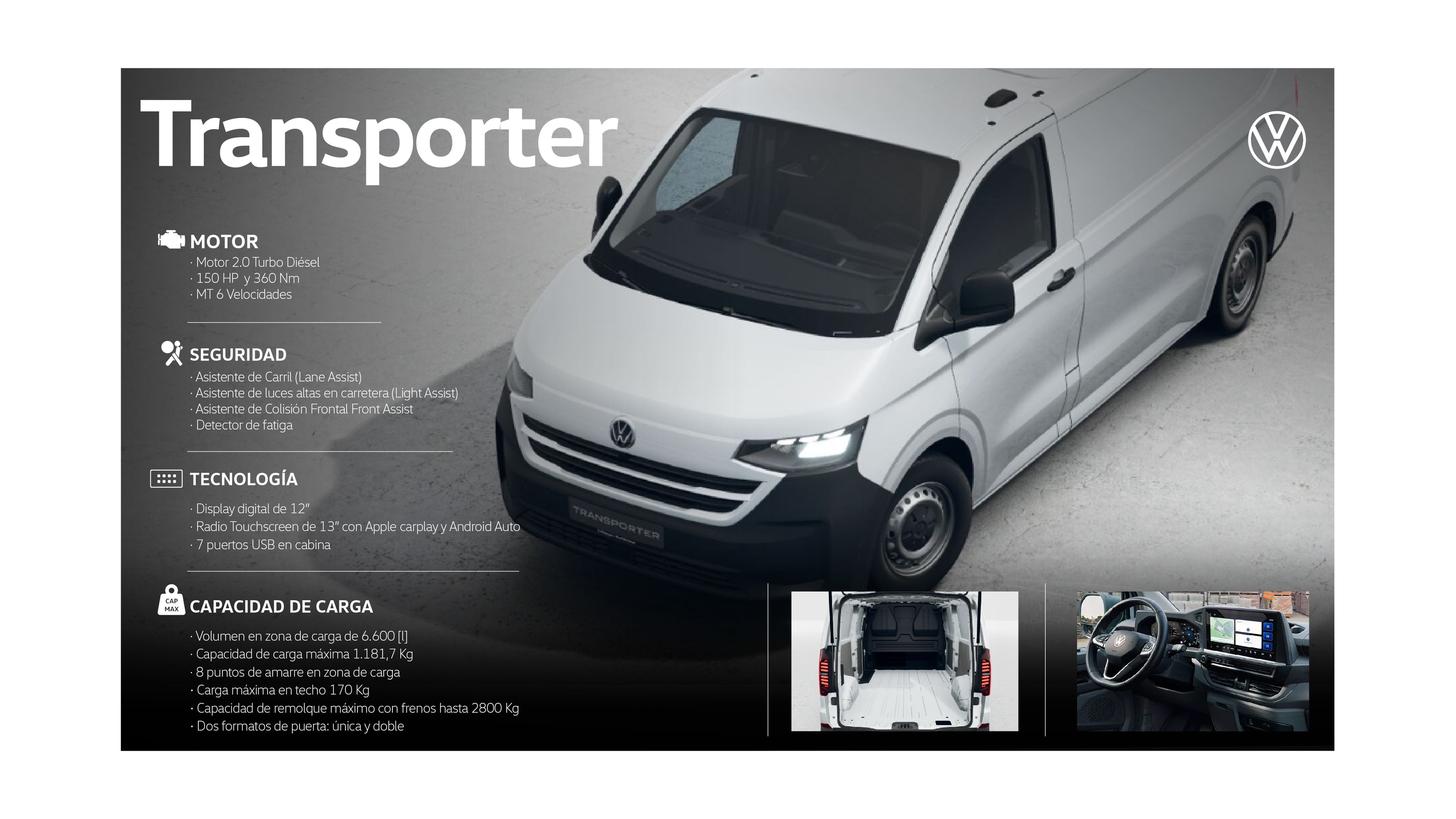 Diseñado para quienes necesitan más que un vehículo de trabajo, el nuevo Transporter combina potencia, espacio y tecnología para que tu negocio avance sin límites. Con una gran capacidad de carga, alto rendimiento y conectividad inteligente, está listo para acompañarte en cada desafío y ayudarte a llegar más lejos, todos los días.
