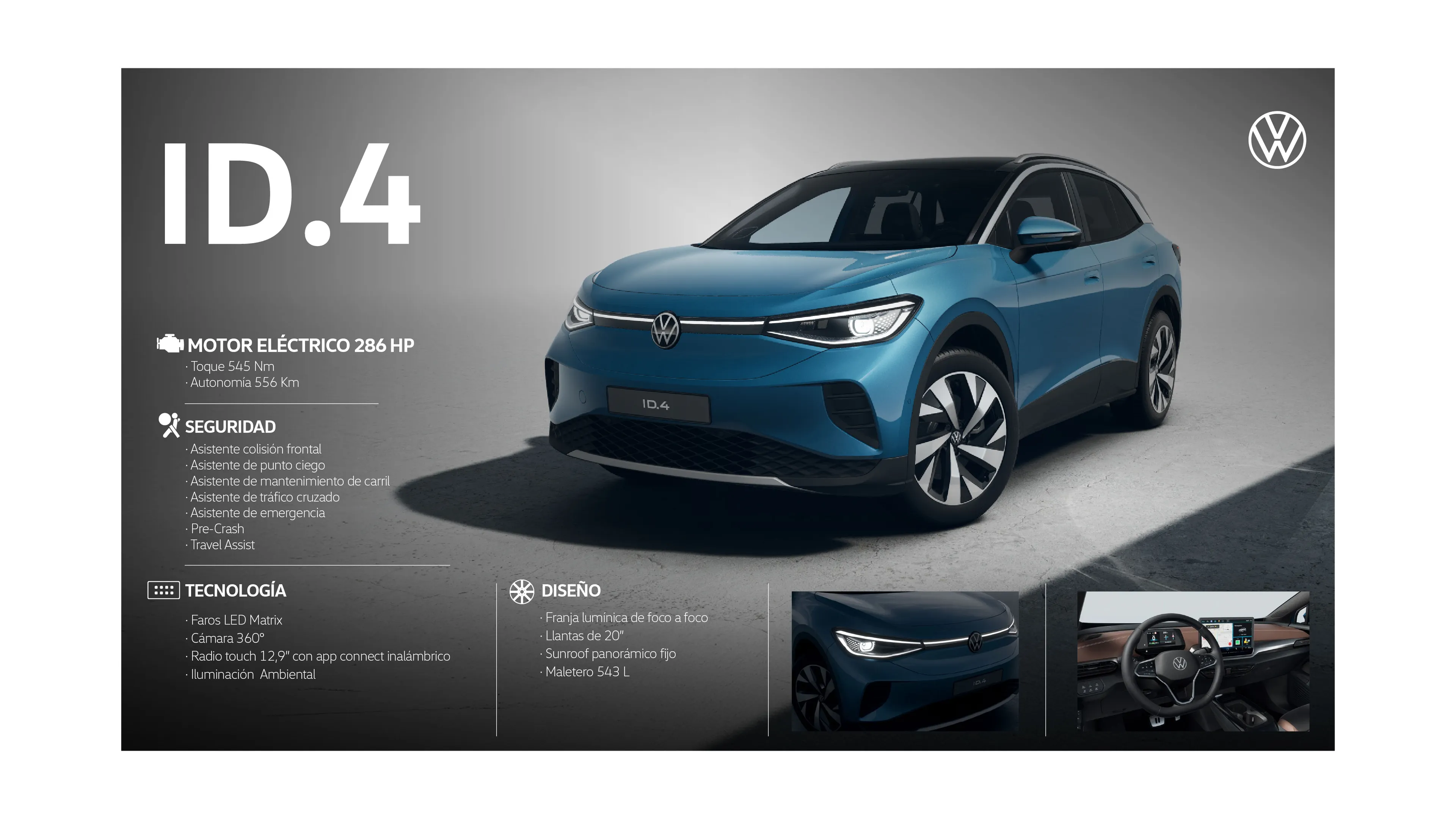 Descubre una nueva forma de moverte: un interior que respira libertad, un rendimiento eléctrico que responde con fuerza y una tecnología tan intuitiva que se adelanta a tus necesidades. Al volante del ID.4, cada trayecto se siente ágil, silencioso y emocionante. Si sueñas con un SUV eléctrico que conserva la emoción de conducir, este es el comienzo de ese viaje.