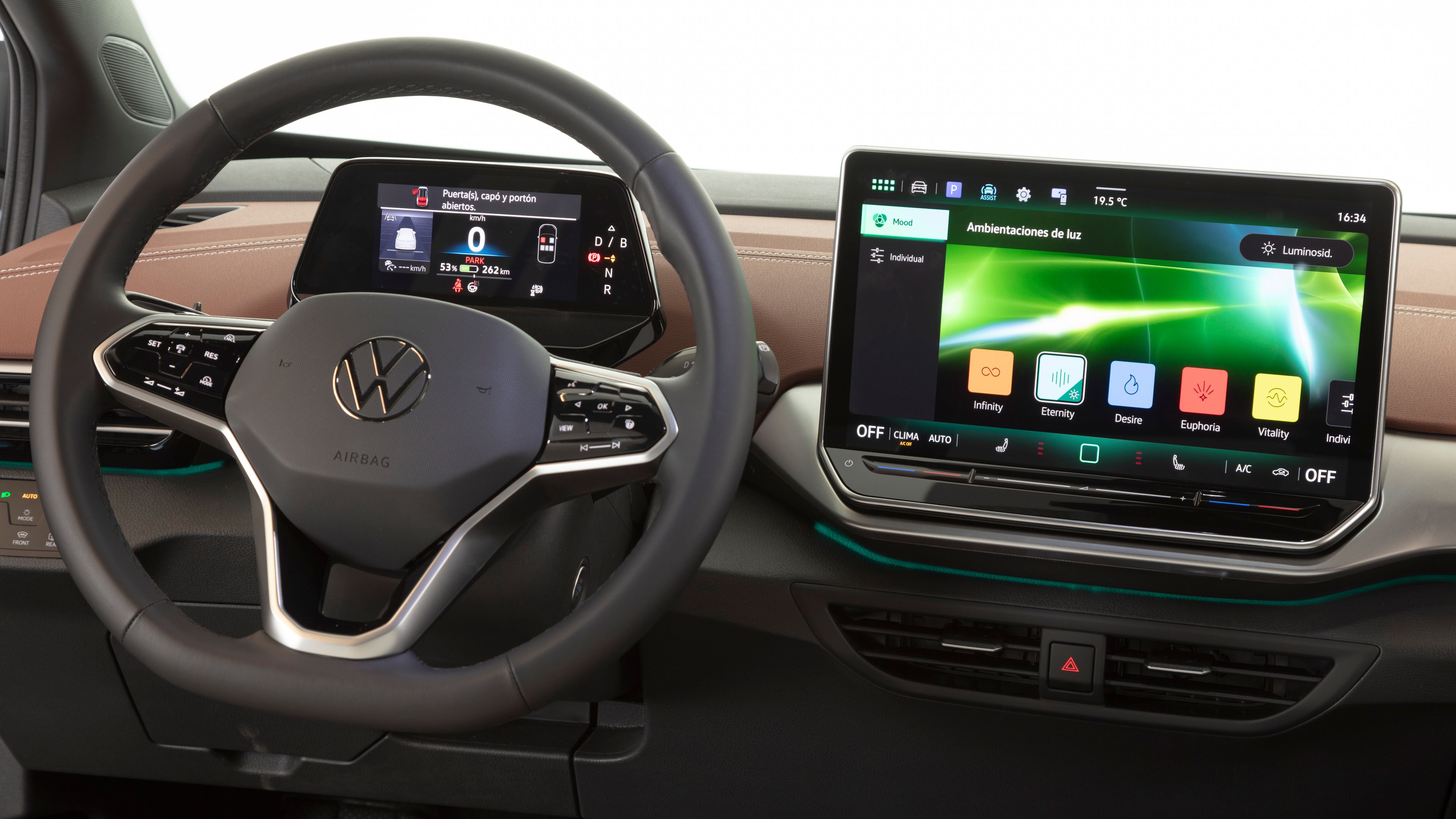 El tablero frontal en cuero con costuras en blanco resalta la elegancia del interior del ID.4. Un contraste sutil y sofisticado que eleva la experiencia visual y táctil a bordo.