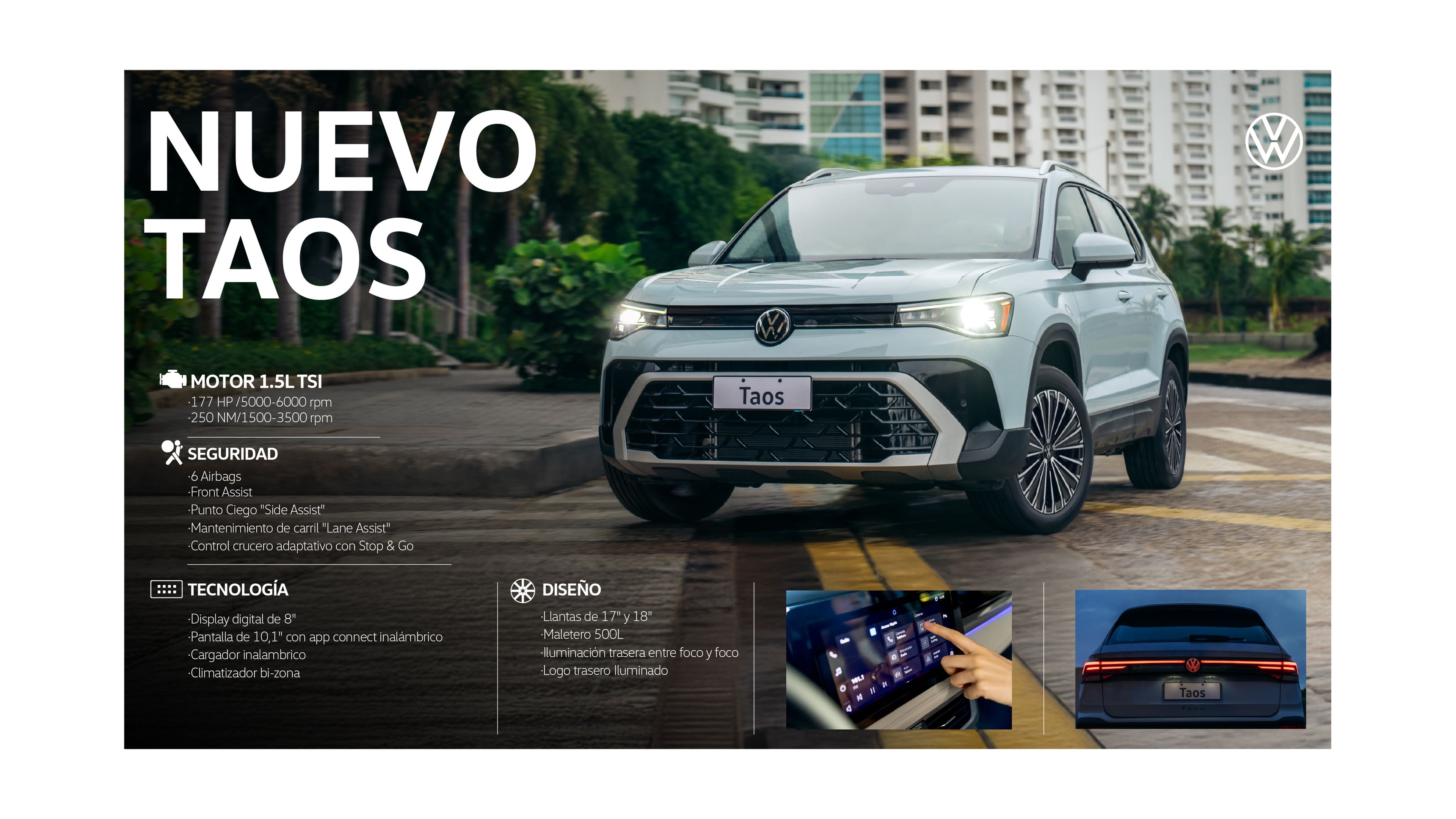 Las luces LED traseras con luz de foco a foco del Nuevo Taos crean una firma visual continua y sofisticada que realza su diseño. Además de aportar mayor visibilidad, refuerzan su carácter moderno y hacen que destaque desde cualquier ángulo, incluso cuando se aleja.
