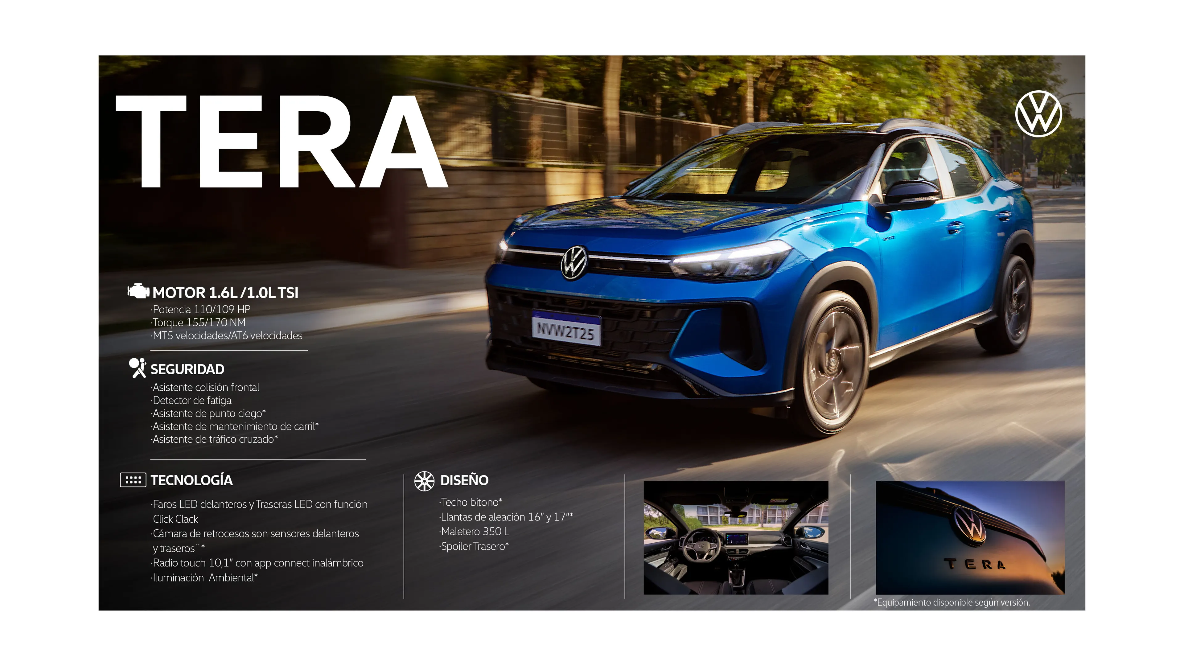 ¡El Nuevo Tera no es solo un SUV, es tu puerta de entrada al mundo SUVW! Su diseño audaz y lleno de personalidad te invita a romper con lo convencional y animarte a más. Tera es el nuevo SUVW de entrada, pensado para quienes quieren comenzar su viaje con todo el carácter y la tecnología que distinguen a Volkswagen. Descubrelo y animate a dar el primer paso.
